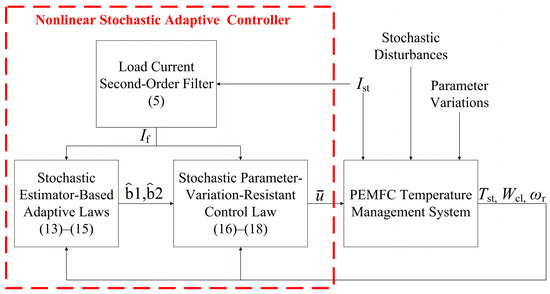 Han et al. designed a model reference adaptive feedback controller to address uncertainties and robustly regulate both the stack and coolant inlet temperatures of PEMFCs [12]. Li et al. regarded model uncertainties, external disturbances, and parameter variations as “total disturbance” to be estimated and compensated and proposed an active disturbance rejection control with a switching law [13]. Yan et al. designed the residual generator of sensor faults by Dulmage–Mendelsohn decomposition to rearrange the biadjacency matrix of the thermal model, thereby developing a sliding-mode-based active fault-tolerant control strategy for PEMFC thermal management [14]. Zang et al. addressed issues including erroneous control caused by sensor faults and strong nonlinearities induced by external current loading and proposed a fault-tolerant temperature control method based on an adaptive strong tracking Kalman filter combined with the Hampel algorithm, which significantly enhanced system stability [15]. These studies have made significant contributions to the temperature control of PEMFC stacks and to addressing parameter uncertainties and external disturbances. However, none of these works have considered the impact of stochastic disturbances on PEMFCs. In practical operating environments, stochastic disturbances can significantly affect PEMFC performance [16]. For example, stochastic disturbances in the load current influence the oxygen excess ratio [17], while stochastic disturbances in temperature affect the fuel cell voltage [18] and output power [19]. Therefore, it is essential to consider the impact of stochastic disturbances on the PEMFC; otherwise, its actual operational performance may degrade.