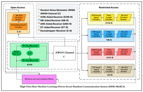 Therefore, this paper introduces an unconventional, high-data-rate, machine-learning-driven, secure random communication system (HDR-MLRCS). The design integrates widely used ML algorithms, i.e., SVM, NB, kNN, and DT, in a unified RCS architecture. The proposed architecture is divided into restricted and open-access modes to depict the intended reception scenario and the eavesdropping scenario, respectively. For the restricted-access mode, the HDR-MLRCS performs encryption and decryption of α-stable noise to covertly convey binary information from a transmitter to the intended receivers in a additive white Gaussian noise (AWGN) channel. The HDR-MLRCS employs a random noise modulator (RNM), which transmits skewed α-stable (SkαS) noise as random carrier signals. The RNM conveys the binary information ‘0’ and ‘1’ by exploiting the inherent skewness of the α-stable distribution. The intended receivers, support vector machine-aided receivers (SVM-R), Naïve Bayes-aided receivers (NB-R), k-Nearest Neighborhood-aided receivers (kNN-R), and decision tree-aided receivers (DT-R), are pretrained on a restricted-access dataset (R-𝓓) privately available within the HDR-MLRCS architecture. The R-𝓓 comprises secret values of SkαS noise parameters, mutually selected by RNM and intended receivers, which no eavesdropper can know without prior knowledge. Moreover, the RNM and intended receivers exclusively possess a static secret key—the pulse length—for possible extraction of the binary information from the transmitted signals. Only the intended receivers can perform successful decryption after pretraining through R-𝓓 and utilizing a static secret key. On the contrary, in the open-access mode, the potential eavesdropper-receiver (E-R) attempts decryption using SVM, NB, kNN, and DT, which are pretrained on the open-access dataset (O-𝓓). The O-𝓓 consists of all possible combinations of values of SkαS noise parameters for possible decryption of the transmitted signals. We have shown that the E-R cannot perform any meaningful extraction of the binary information without the knowledge of R-𝓓 and the static secret key. Since the intended receivers could extract binary bits from the fewest number of SkαS noise samples, we achieved very high data rates through HDR-MLRCS compared to previously proposed counterparts. The novel integration of prominent ML algorithms into a single architecture provides enhanced PLS and solves the problem of low data rates encountered by unconventional RCSs. It also shows a comparison of performance among prominent ML algorithms when encrypting and decrypting α-stable noise signals. Therefore, the proposed architecture adds value to the category of transmitter–receiver authentication schemes. It incorporates ML to provide boosted PLS and higher data rates. The results collectively demonstrate HDR-MLRCS as a promising unconventional communication paradigm.