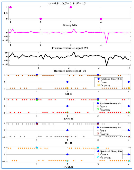 If we consider the first set of predicted values of {} containing the binary information bit ‘1’ shown in Rows 4–7 in Figure 2, the SVM-R encountered the fewest errors, i.e., three out of fifteen. On the contrary, DT-R, kNN-R, and NB-R encountered five, six, and seven errors, respectively. We also saw similar trends for the later sets of predicted {} containing “0, 1, 0”. This shows the superior decryption capability of SVM-R over the other intended receivers. It is important to note that all intended receivers successfully recovered the transmitted binary information bits “1, 0, 1, 0”. However, analyzing it for a larger number of bits in the later section would further prove the practicality of the proposed HDR-MLRCS.