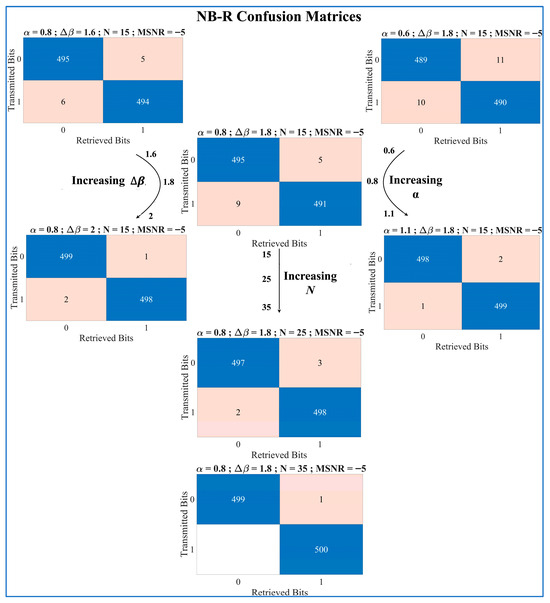 The confusion matrices of the NB-R in Figure 3 depict the HDR-MLRCS’s decryption ability with a fixed channel impairment (MSNRdB = −5 dB). We observed that all combinations of the restricted-access keys successfully retrieved the binary digits. However, performance continued to increase further when utilizing higher values of , and .