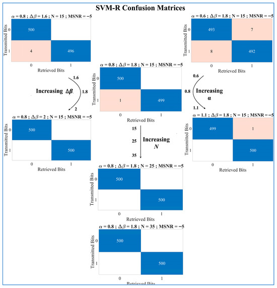 Confusion matrices of the SVM-R as intended receiver reflecting the individual effects of , and on 1000-bit transmission at MSNRdB = −5 dB. The figure clearly shows optimized decryption while utilizing a higher value combination of the restricted-access keys.