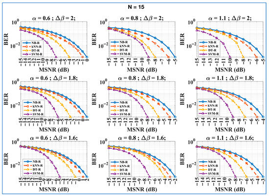 BER vs. MSNRdB plots of intended receivers (NB-R, DT-R, kNN-R, and SVM-R) for all possible combinations of and ; = 15 and total transmitted bits = 1000. Bottom to top: plots with varying = 1.6, 1.8, 2 with fixed result in performance increment; left to right: plots with varying = 0.6, 0.8, 1.1 with fixed result in performance increment. The figure reflects HDR-MLRCS performance under various channel impairments.