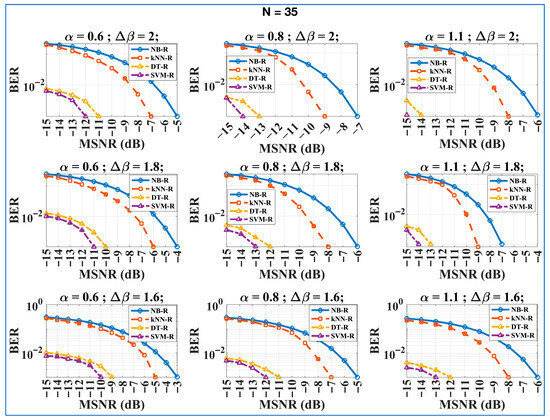 BER vs. MSNRdB plots of intended receivers (NB-R, DT-R, kNN-R, and SVM-R) for all possible combinations of and ; = 35 and total transmitted bits = 1000. Bottom to top: plots with varying = 1.6, 1.8, 2 with fixed result in performance increment; left to right: plots with varying = 0.6, 0.8, 1.1 with fixed result in performance increment. The figure reflects HDR-MLRCS performance under various channel impairments.