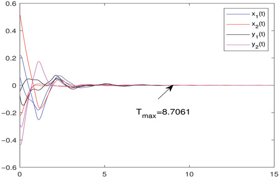 From (46), one has , . We select , , . The first control subintervals are , , , , , the total operation time is 15 s, and . Oher parameters of (14) are shown in Table 2. By easy calculation, we get , and all requirements of Theorem 1 hold. Then, system (46) can achieve FS and . Now, choose two initial values for each state randomly, and Figure 2 shows the FS of BAM-IMNN (46).