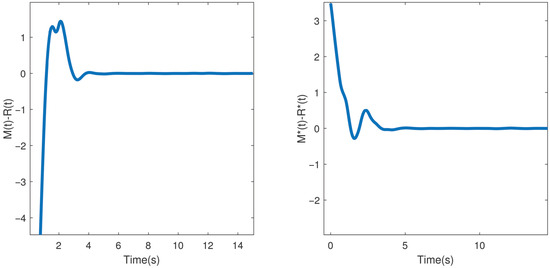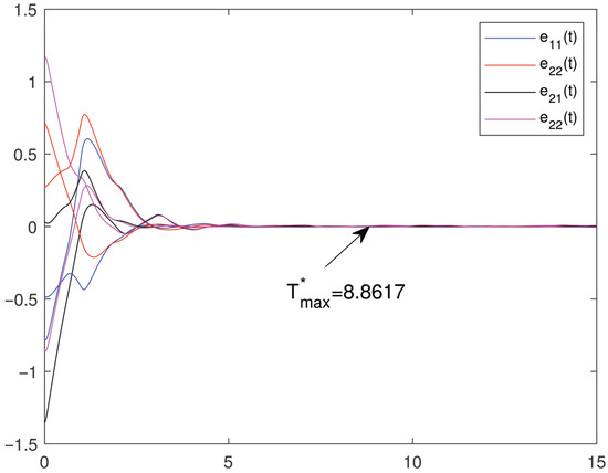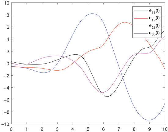 where , is the transmitted signal. And we let , . We assume is the information message, so can be recovered by , . Based on Example 2 and using , Figure 6 shows the error system between (46) with and (47) with , . We can see that the signal can be restored through controller (30).