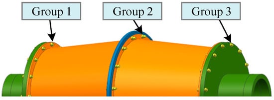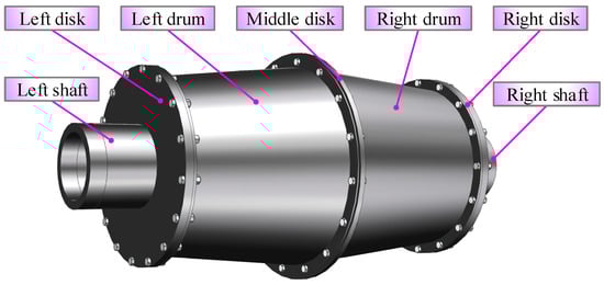 A simplified disk–drum–shaft coupled structure (as shown in Figure 1) is taken as the research object in this paper. This structure is obtained by simplifying the high-pressure rotor structure of an aircraft engine. It includes three typical structures: disks, drums, and hollow shafts. The structure is symmetrical on both sides, including a left shaft, a right shaft, a left disk, a middle disk, a right disk, a left drum, and a right drum. The disk and drum are connected by drum flanges and bolts, while the shaft and disk are fixedly connected.