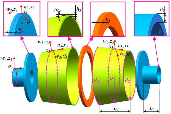 Orthogonal curvilinear coordinate systems are established for the disk, drum, and shaft, respectively. The local displacement of the left shaft, left disk, left drum, middle disk, right drum, right disk, and right shaft at any point on the center plane can be represented as in the cylindrical coordinate system. Among them, , and are consistent in all directions, and are consistent in all directions.