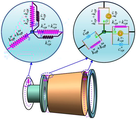 where , , , and are the stiffness matrixes of the composite spring connection between the left shaft and the left drum, the left drum and the middle plate, the right drum and the middle plate, and the right shaft and the right drum, and are the stiffness matrixes of the spring connection between the left shaft and the left boundary, and between the right shaft and the right boundary.