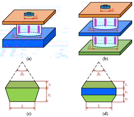 In addition, it can be considered that when a bolt in a bolted joint is preloaded, it generates a circular pressure zone, and the size of this circular area is related to the nominal diameter of the bolt. This pressure zone is generally referred to as the bolt influence zone, as shown in Figure 5a,b. The mechanical effects in the bolted connection area are essentially non-uniform. To simulate the non-uniformity of each bolted connection area, it is assumed that the stiffness of a continuously distributed spring varies linearly in the radial direction within a circular region, and complex stiffness springs are used to simulate bolted connections within the bolt influence area. As shown in Figure 5c,d, represents the length of the bolt-affected zone of the bolt connection plate. Its length can be determined based on the structural parameters of the bolt joint, as shown as follows: