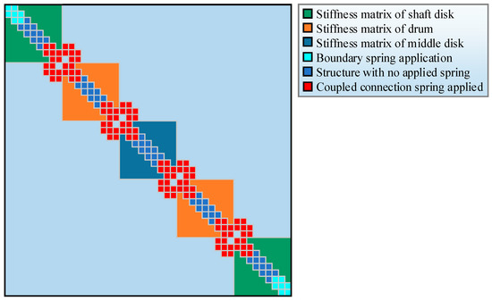 where and are the total stiffness matrix and total mass matrix of the disk–drum–shaft coupled structure, respectively. The specific grouping method of the stiffness matrix is shown in Figure 6.