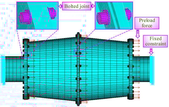 Finite element models of the disk, drum, shaft, and bolts are established using SOLID186 solid elements. Contact pairs, including bolt head–disk contact pairs, disk–drum flange contact pairs, and nut–drum flange contact pairs are created to simulate the connection effect of the bolted joint. The contact parameters of the bolted joint include dynamic friction coefficient, tangential stiffness coefficient, and normal stiffness coefficient, which are 0.3, 0.3, and 1.1, respectively. A preload of 3125 N (equivalent to a preload torque of 5 N·m) is applied to the bolt shank in each bolted joint. Fixed constraints are applied to both ends of the shaft as boundary conditions. Through the above steps, the finite element model of the entire disk–drum–shaft coupled structure is established as shown in Figure 7. This finite element model has a total of 93,474 elements and 375,197 nodes.