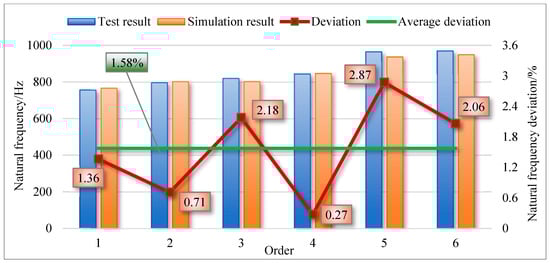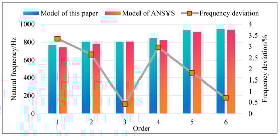 The first six orders of natural frequencies calculated by the two models are selected for comparison, and the comparison results are shown in Figure 8. The maximum deviation of the natural frequencies between the two models is 3.36%, the minimum deviation is 0.42%, and the average deviation is 1.99%. It can be seen from the comparison results that the natural frequencies solved by the model proposed in this paper are in good agreement with those solved by the ANSYS model.