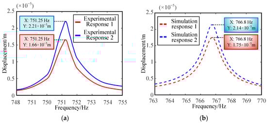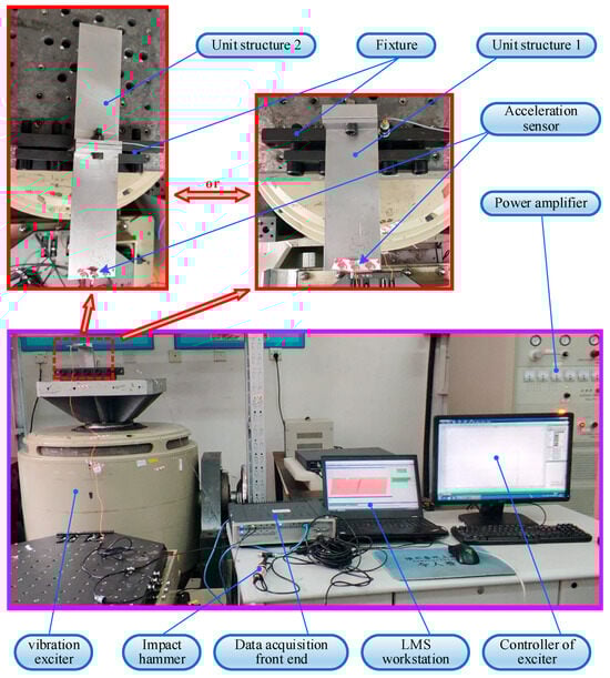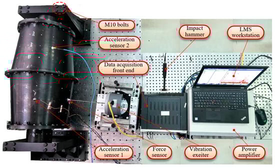 The experimental testing system for the disk–drum–shaft coupling structure is shown in Figure 9. The main hardware equipment required for the experimental testing system is shown in Table 1. The material parameters of the disk, drum, and shaft are shown in Table 2. The two ends of the coupling structure are fixed on the fixture with 8 M10 bolts, with the pre-tightening force of each bolt set to . The pre-tightening force of the bolts inside the disk–drum–shaft coupled structure is . The modal testing and response testing will be conducted through this testing system. The impact method is used for modal testing. A point excitation exciter is used to provide excitation force for response testing. In order to effectively ensure the collection effect of the response, two acceleration sensors are arranged at different positions on the test piece.