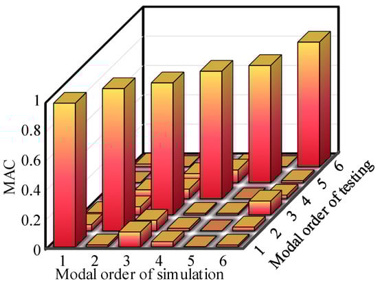 (2) Dual verification is conducted using the ANSYS solid element model and physical experiments. In terms of modal characteristics, the maximum deviation of the first to sixth order natural frequencies from the ANSYS results is only 3.36% (with an average of 1.99%), and the maximum deviation from the experimental results is 2.87% (with an average of 1.58%). The average Modal Assurance Criterion (MAC) with the experimental results reaches 0.895, indicating a high degree of modal shape matching. In terms of vibration response, the deviation between the experimental value and the simulated value of the first-order resonance frequency is 2.07%, and the deviations of the displacement response amplitudes at the two points are 4.07% and 5.42%, respectively, all verifying the accuracy of the model.