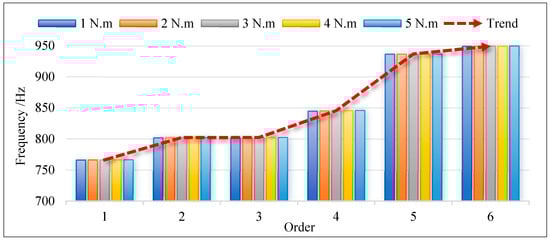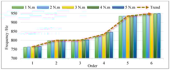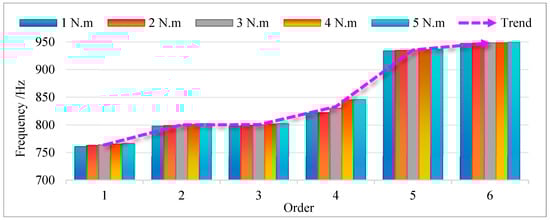 (1) The stiffness of the overall structure has been moderately improved. It is true that an increase in preload will enhance the contact stiffness of the contact surface and the axial stiffness of the bolts, thereby improving the overall stiffness of the disk–drum–shaft coupled structure. However, it should be noted that the overall stiffness of the disk–drum–shaft coupled structure is mainly dominated by the inherent stiffness of its base components (the disk, drum, and shaft are all made of 45 steel), and the additional stiffness contributed by the bolted joints accounts for only a small proportion of the total stiffness. This is also confirmed by the modal analysis results in Section 4.1, Section 4.2 and Section 4.3. When the preload torque increases from 1 N·m to 5 N·m, the maximum increase in the 1st to 6th order resonance frequencies is only 2.87% (4th order mode), indicating that the effect of increasing the bolt preload on improving the overall stiffness is limited.