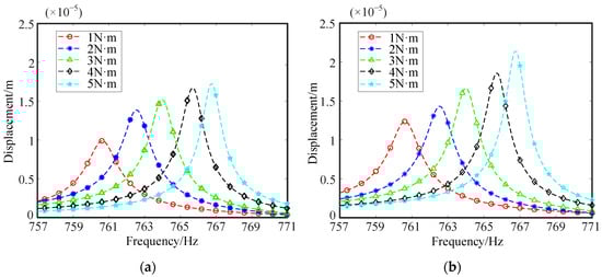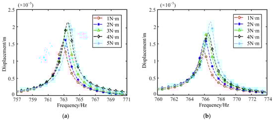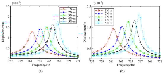 Similarly, based on the variation in bolt pre-tightening torque in condition three, simulation calculations are conducted to obtain the vibration response of the disk–drum–shaft coupled structure under various pre-tightening forces. The resonance frequencies of one to six orders under different pre-tightening torques are shown in Figure 21. It can be seen that as the pre-tightening torque of the bolt increases, the resonance frequency of each order shows a small increasing trend. Compared to other orders, the resonance frequency of the 4th order increases significantly. Therefore, the overall trend of changes from first to sixth order is consistent under different pre-tightening torques. Meanwhile, the displacement responses of two points in the structure are extracted, and the displacement response curves under different pre-tightening torques are shown in Figure 22. Furthermore, the displacement response amplitudes of two points under different pre-tightening torques are extracted for trend analysis. As shown in Figure 23, with the increase in pre-tightening torque, the displacement response amplitudes of both points show an increasing trend.