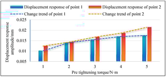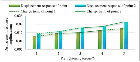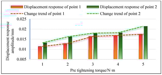 According to the variation in bolt pre-tightening torque in condition one, the connection stiffness and damping of the corresponding bolt group are introduced into the model, and the vibration response of the disk–drum–shaft coupled structure under each pre-tightening force is calculated separately. The resonance frequencies of one to six orders under different bolt pre-tightening torques are shown in Figure 15. From the graph, it can be seen that as the pre-tightening torque of the bolt increases, the resonance frequency of each order shows a slight increase trend. Among these orders, the fourth order resonance frequency exhibits a significant increase compared to the other orders. It is precisely for this reason that the overall change trend of resonance frequencies from first order to sixth order is consistent under different pre-tightening torques. Meanwhile, the displacement responses of two points in the structure are extracted, and the displacement response curves under different pre-tightening torques are shown in Figure 16. Furthermore, the displacement response amplitudes of two points under different pre-tightening torques are extracted for trend analysis. As shown in Figure 17, with the increase in pre-tightening torque, the displacement response amplitudes of both points show an increasing trend.