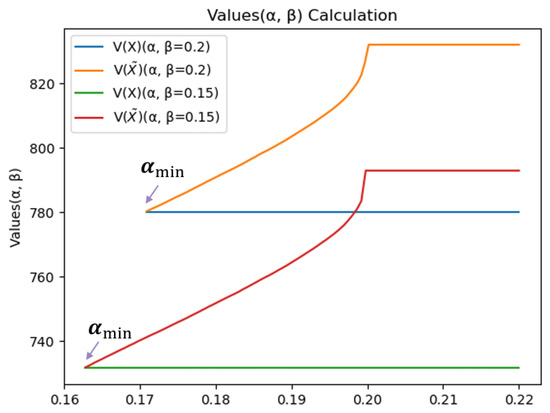 where in (1), represents a small predetermined risk threshold of the pledgee, typically 5% or 1%, and is the distribution function of random variable X. The value V (referred to as collateral value) ensures that the probability of the data asset X falling below V does not exceed . Expressed differently, if a bank extends credit V against the data asset, the probability of the asset’s return dropping below this credit amount (potentially triggering insolvency) remains bounded by the predefined risk level . Clearly, if , then the data asset X is not valuable at the risk level in the pledgee’s perspective. Different risk thresholds typically lead to different values of a same data asset.