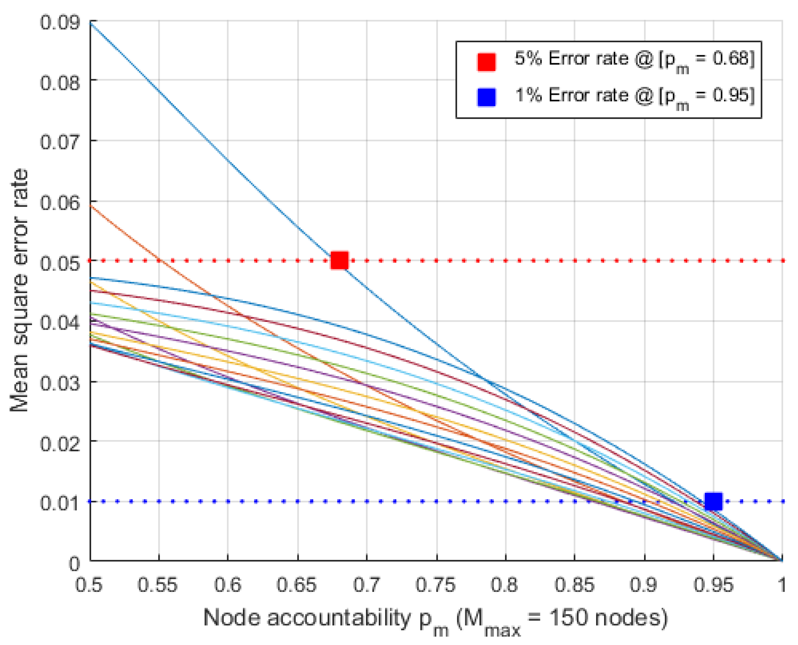 This figure presents the simulated accountability of each node for parameters , , and which offer a gap analysis between two different calculation. This evaluation quantifies the discrepancy between the expected value of the function applied to the random variable and the function applied to the expected value of the random variable. The results demonstrate that the approximation holds with acceptable accuracy under the tested conditions, supporting the use of as a computationally simpler surrogate for in relevant stochastic modeling scenarios. In this scenario, the random capacity follows a Binomial distribution with parameters n and success probability p (i.e., ). The graph shows how MSER decreases as node accountability increases, reflecting improved system reliability with higher accountability . Two key points are highlighted: higher node accountability correlates with improved system performance due to more reliable nodes. Key highlights include a 5% error rate when the average node accountability exceeds approximately 68% (i.e., ), and a further reduction to a 1% error rate when node accountability reaches 95% or higher (i.e., ). Higher node accountability substantially reduces the MSER. The graph demonstrates that accounting for variations in node behavior using closely approximates the original function . This underscores the importance of considering stochastic variations in network nodes to effectively optimize error rates.