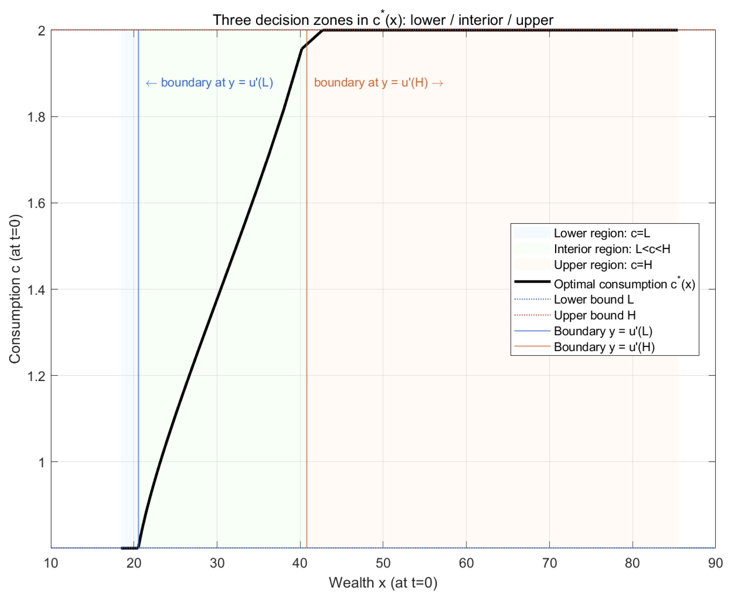 in the absence of frictions. In practice, however, households face binding lower bounds (subsistence needs, fixed living costs) and upper bounds (liquidity limits, habit or adjustment frictions, physical saturation), which fundamentally alter both consumption smoothing and portfolio choice. Ignoring such bounds can generate implausible spikes in consumption and overly aggressive rebalancing, especially when wealth or investment opportunities move sharply.