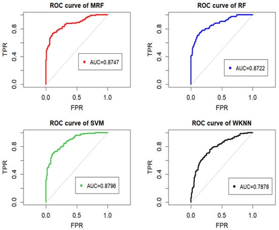 As shown in Figure 3, the ROC curves of different prediction models on Test Set II are presented. The MRF model achieves an AUC value of 0.8727, which is higher than that of the SVM and WKNN models but slightly lower than that of the RF model. This suggests that incorporating stepwise regression analysis can effectively enhance the performance of the MRF model in forecasting the CSI 300 stock index.