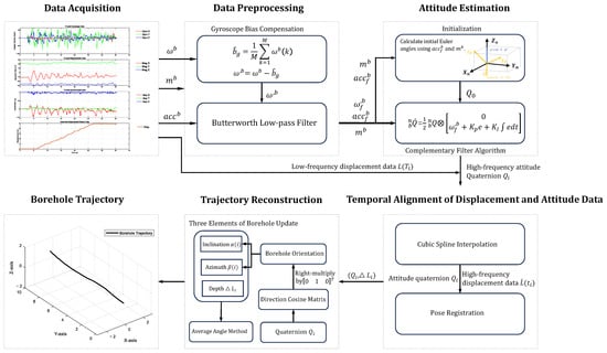 To achieve rapid and accurate reconstruction of borehole trajectories, this paper establishes a complete reconstruction pipeline, which comprises five key steps (as illustrated in Figure 2): (1) Data Acquisition; (2) Data Preprocessing; (3) Attitude Estimation; (4) Temporal Alignment of Displacement and Attitude Data; and (5) Trajectory Reconstruction.