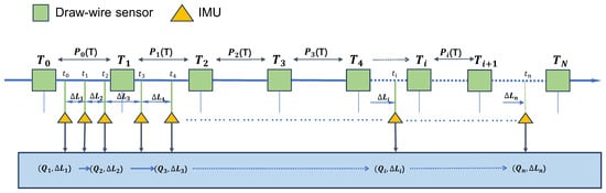Attitude and Displacement Data Alignment and Fusion Based on the Displacement Time Base. The green squares represent the discrete sampling instances Ti of the draw-wire sensor, while the yellow triangles represent the high-frequency sampling instances ti of the IMU. The horizontal arrows between the Pi(T) labels represent the piecewise polynomial interpolation process between displacement samples. The vertical black arrows indicate the mapping of IMU attitude data Qi to the corresponding displacement increments ∆Li, forming the fused data pairs shown in the blue box.