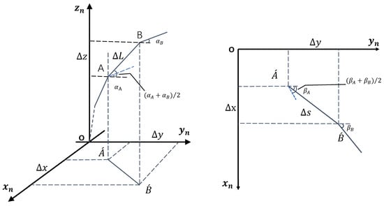 Schematic of the Average Angle Method for Borehole Trajectory Calculation. The dashed lines represent the projection of the borehole segment AB onto the coordinate axes and the horizontal plane to illustrate the geometric derivation of the coordinate increments ().