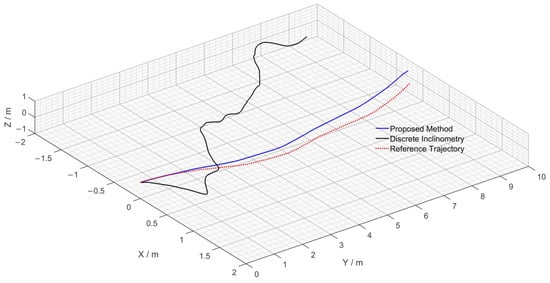 In contrast, the discrete inclinometry method, although showing relatively high accuracy in the initial stage, reveals its inherent limitations as the path length increases. Specifically, during long-distance dynamic operation, the complex magnetic environment and dynamic disturbances cause a continuous cumulative drift in the azimuth angle. Furthermore, the motion-induced acceleration itself becomes a major source of interference for the inclination measurement, thereby significantly degrading its estimation accuracy. As depicted by the black curve in Figure 16, after the travel distance exceeds 1 m, the black curve progressively deviates from the reference trajectory, with errors accumulating rapidly. The trajectory’s azimuth and inclination undergo drastic changes, causing it to exhibit large-amplitude, irregular oscillations in 3D space and completely lose its expected smoothness.