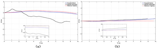 Figure 13b highlights the differences between the two methods in the vertical direction. The projection curve generated by the proposed method maintains a similar undulation rhythm to the reference path. Although a progressive vertical deviation appears in the latter half of the trajectory, its overall smoothness is well-preserved. The YZ-plane projection of the discrete method, however, suffers from two major issues. First, due to its significant lateral tortuosity in the XY-plane, its effective forward travel distance along the Y-axis is severely shortened. This directly results in its trajectory in the YZ projection failing to reach the endpoint, making it shorter than both the proposed method’s and the reference path’s trajectories. Furthermore, in terms of morphology, its path is not a smooth curve but rather a polyline composed of discrete measurement points, characterized by irregular serrations and severe distortion.