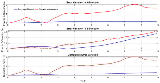 In the lateral direction (X-direction), the error of the proposed method (blue curve) remains consistently within 0.2 m, exhibiting almost no significant drift. This result is in complete agreement with its smooth trajectory that closely follows the reference path in the XY projection. In contrast, the lateral error of the discrete inclinometry method (red curve) increases rapidly at the initial stage of the measurement, exceeding 0.5 m at Y = 1 m. It then drops sharply before embarking on a continuous accumulation process after Y = 2.3 m, accompanied by large oscillations. The maximum deviation exceeds 2 m, eventually stabilizing at 1.6 m at the end of the measurement.