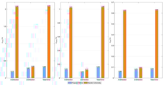To accurately assess the overall error and stability of the two algorithms from a macroscopic perspective, Figure 19 further summarizes and compares their key error statistical metrics in each direction. First, regarding the maximum error metric, the proposed algorithm’s errors in the lateral, vertical, and total components are 0.368 m, 0.168 m, and 0.373 m, respectively. The error peaks are constrained to within 0.4 m. In contrast, the maximum lateral and total errors of the control method are as high as 3.466 m and 3.469 m, respectively, confirming that its estimation system lacks the necessary robustness for long-distance dynamic scenarios.