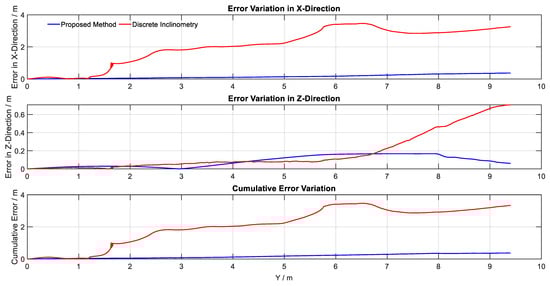 In the longitudinal direction (Z-direction), the errors of both methods show a cumulative trend with distance. The longitudinal error generated by the proposed method grows very gently and smoothly, reaching a final error of 0.25 m. In comparison, the final error for the discrete inclinometry method is 0.31 m. Although this value is not substantially different from that of the proposed method, its error curve does not exhibit smooth growth; instead, it is characterized by noticeable irregular fluctuations throughout the overall accumulation process.