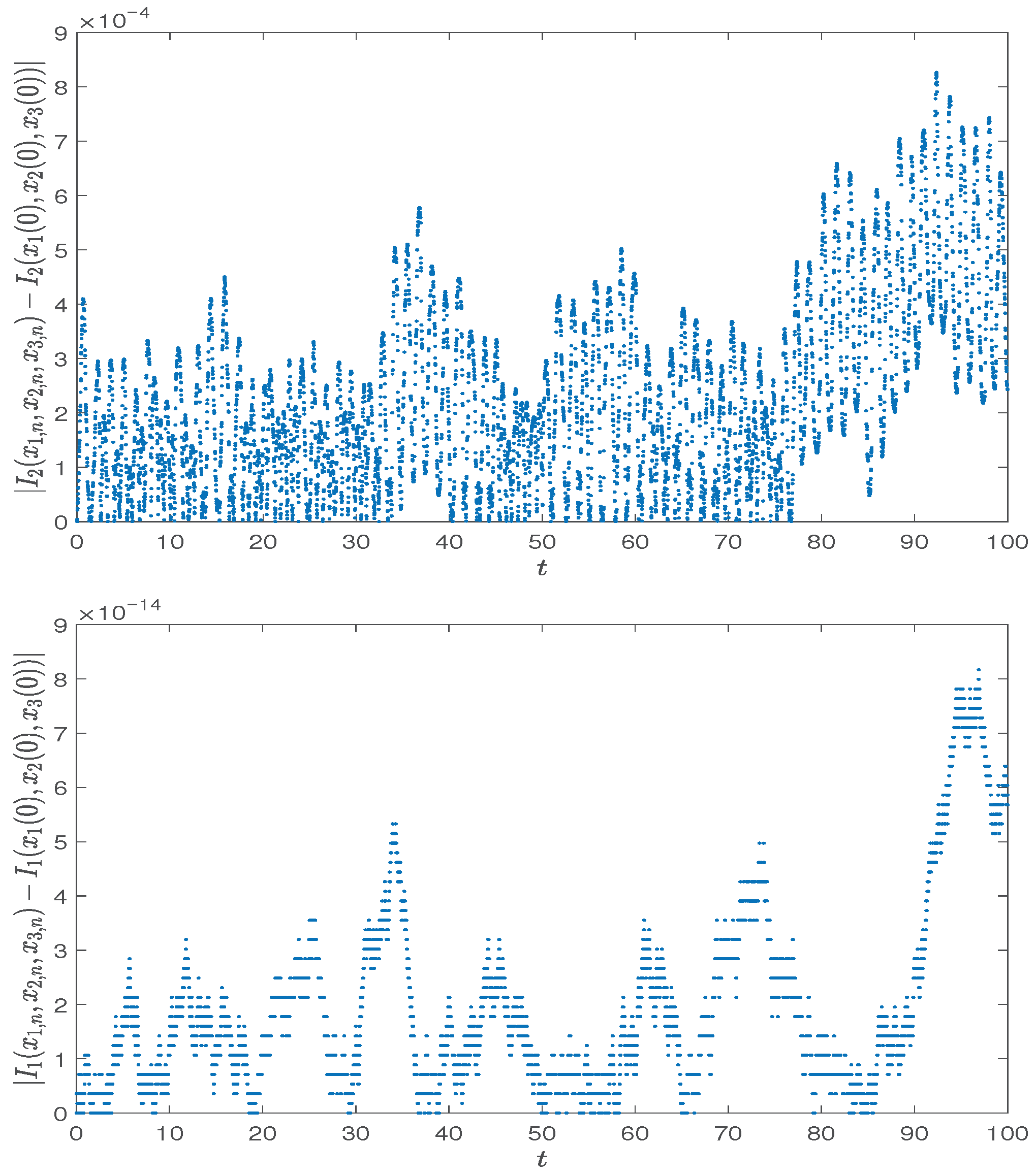 Figure 4. Errors of I 1 (top) and I 2 (bottom) by Milstein method for solving Equation (23).