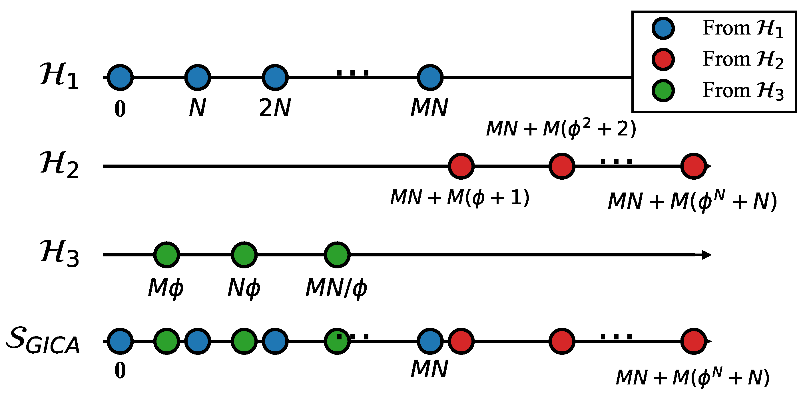 H 1 = { n N } n = 0 M H 2 = { round ( M N + M ( ϕ i + i ) ) } i = 1 N H 3 = { round ( M ϕ ) , round ( N ϕ ) , round ( M N / ϕ ) } S = H 1 H 2 H 3