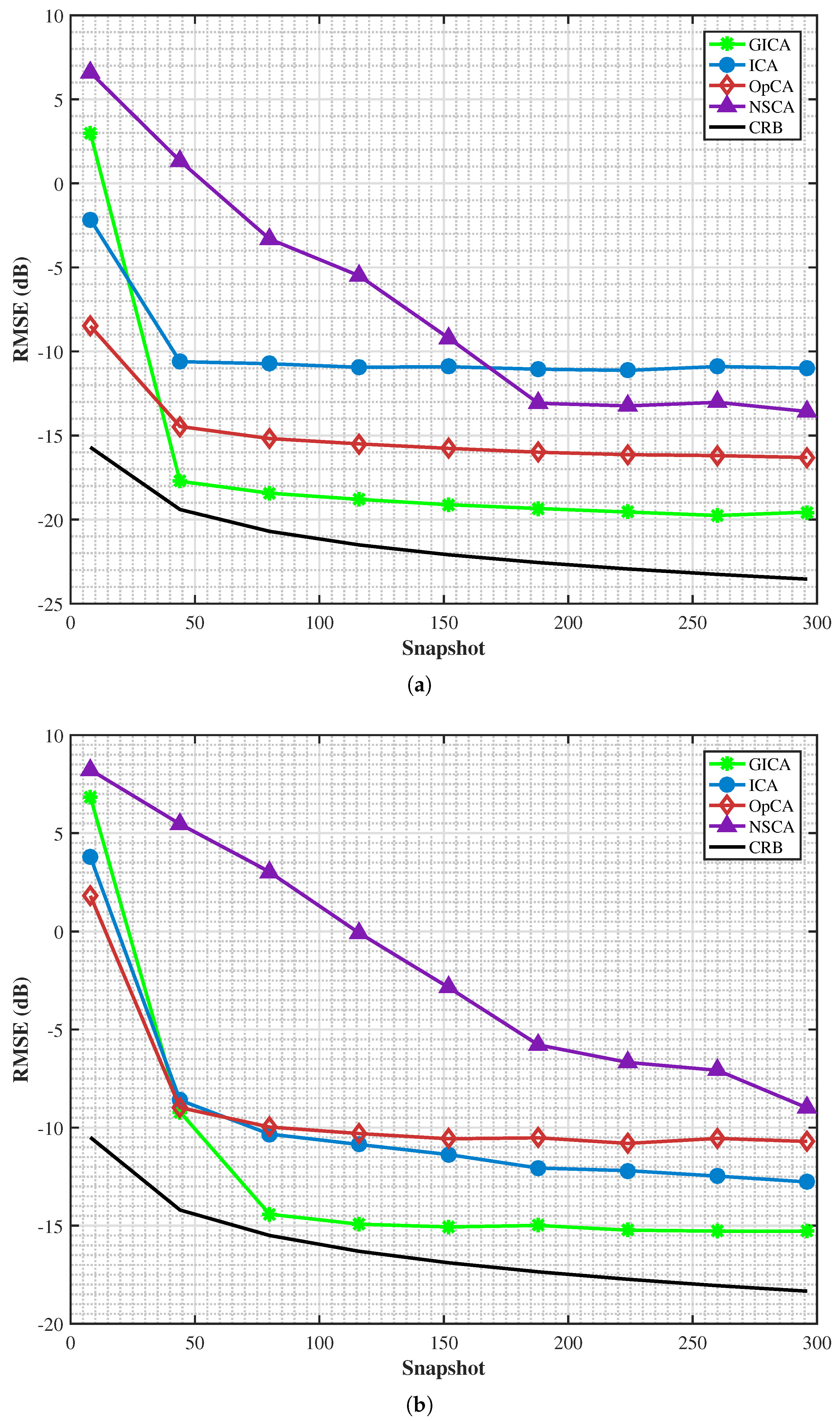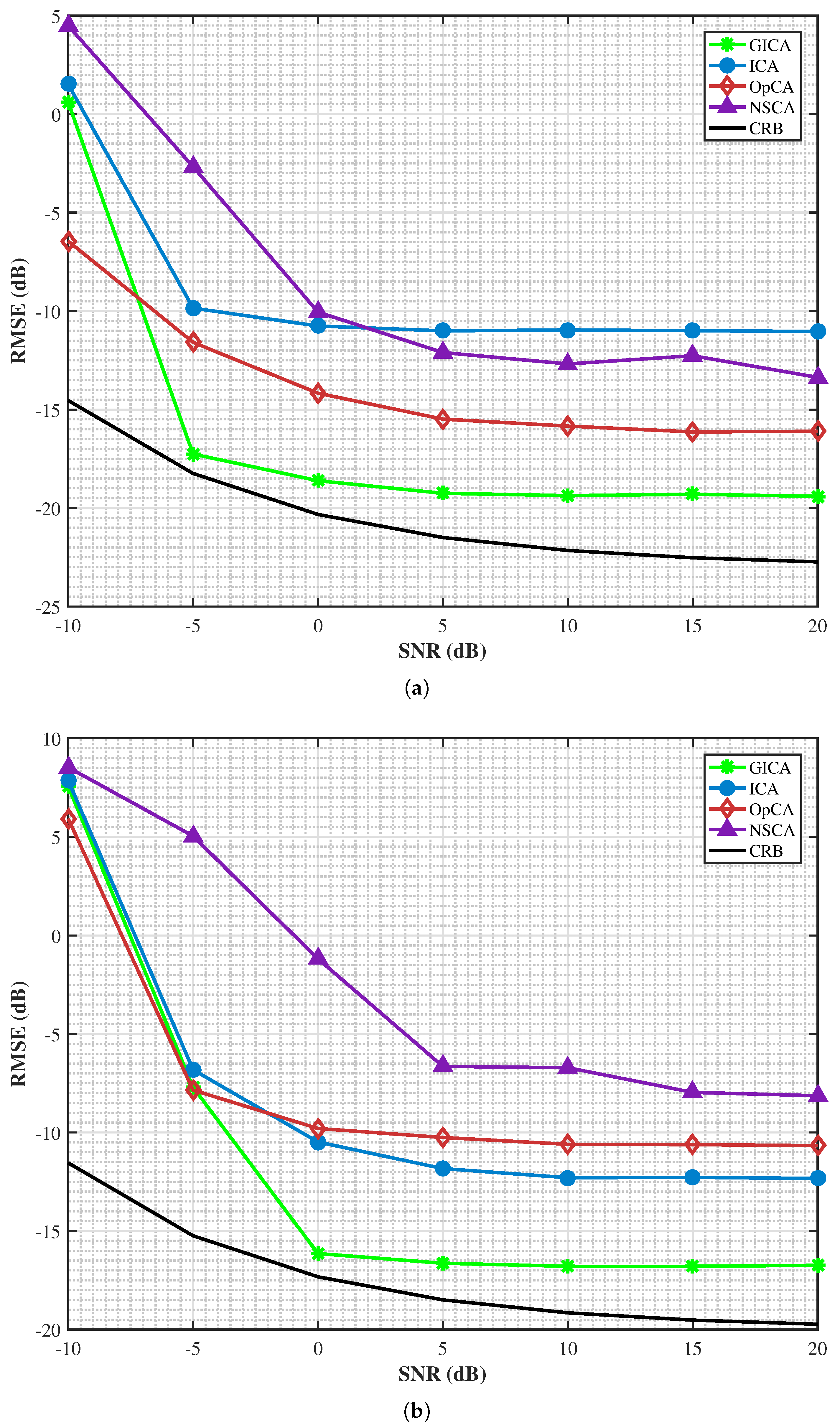 Figure 3 illustrates RMSE performance for both scenarios as a function of SNR. As shown in Figure 3a,b, estimation performance of all array structures improves as SNR increases from 10 dB to 20 dB. The proposed GICA generally exhibits the best performance across the entire SNR range in both scenarios (though slightly inferior to OpCA in very few ranges), with particularly significant advantages in the higher SNR region (≥−5 dB), demonstrating substantially lower RMSE values compared to other structures.
