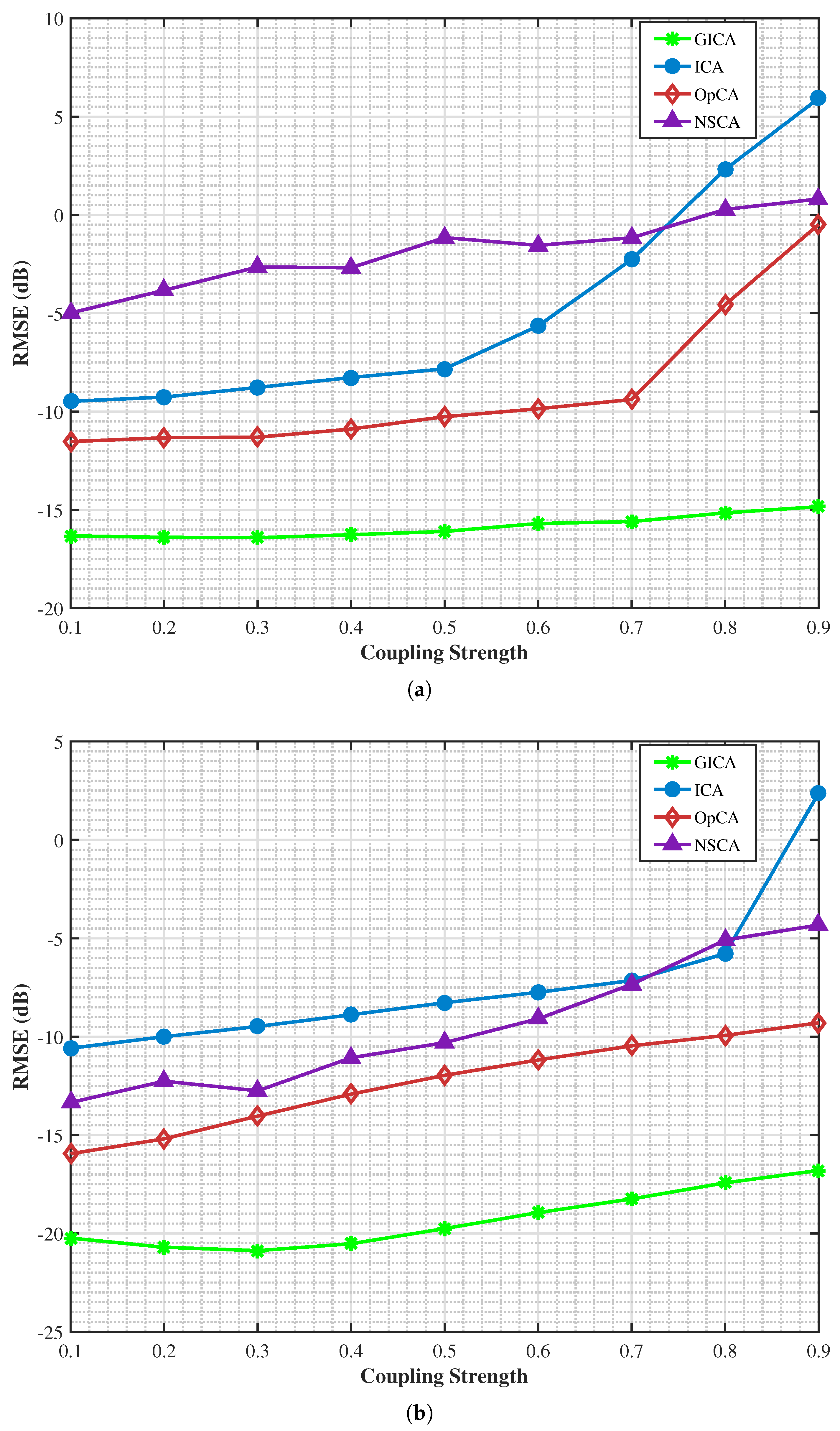 Experiment 4—Coupling Strength Variation: Three signal sources are configured with identical angles as Experiment 1’s three-source scenario. SNR is set to −5 dB and 10 dB with 256 snapshots. Mutual coupling effects are introduced with coupling strength varying from 0.1 to 0.9 across 500 Monte Carlo simulations. DOA estimation uses the same method as Experiment 1.