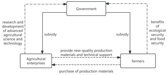 Based on the preceding analysis of the collaborative dynamics among the three parties in new agricultural production, the logical relationships between the main agents in the tripartite evolutionary game model constructed in this study are illustrated in Figure 1.