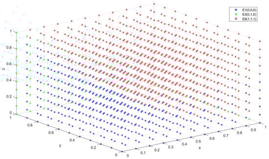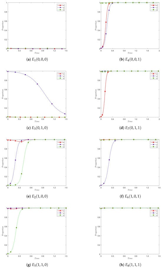 Since asymmetric games require that the evolutionary stable strategies must satisfy both strict Nash equilibrium and pure strategy Nash equilibrium conditions [,], we focus on the stability of eight pure strategy equilibrium points. Mixed strategies cannot be evolutionary stable strategies. The system equilibrium points are determined from the equations , , , yielding the following equilibrium points , , , , , , , .