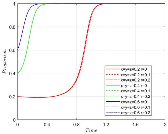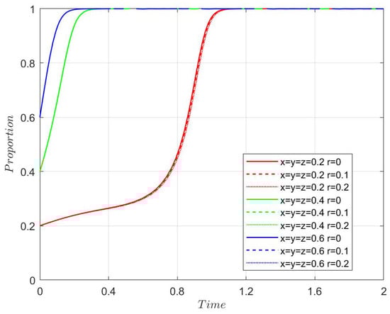 According to (3) and (4), the first-order partial derivatives of each element are obtained as follows: , , , , and the formula (3) does not contain r. Therefore, increasing or decreasing can increase the probability of the government choosing a subsidy, which is irrelevant. □