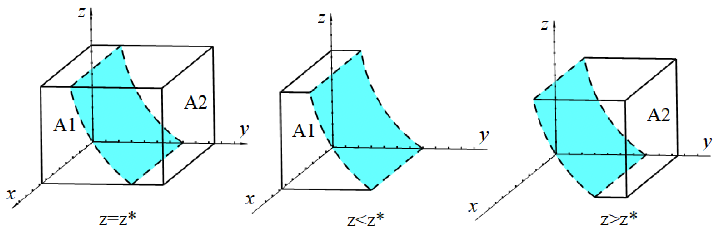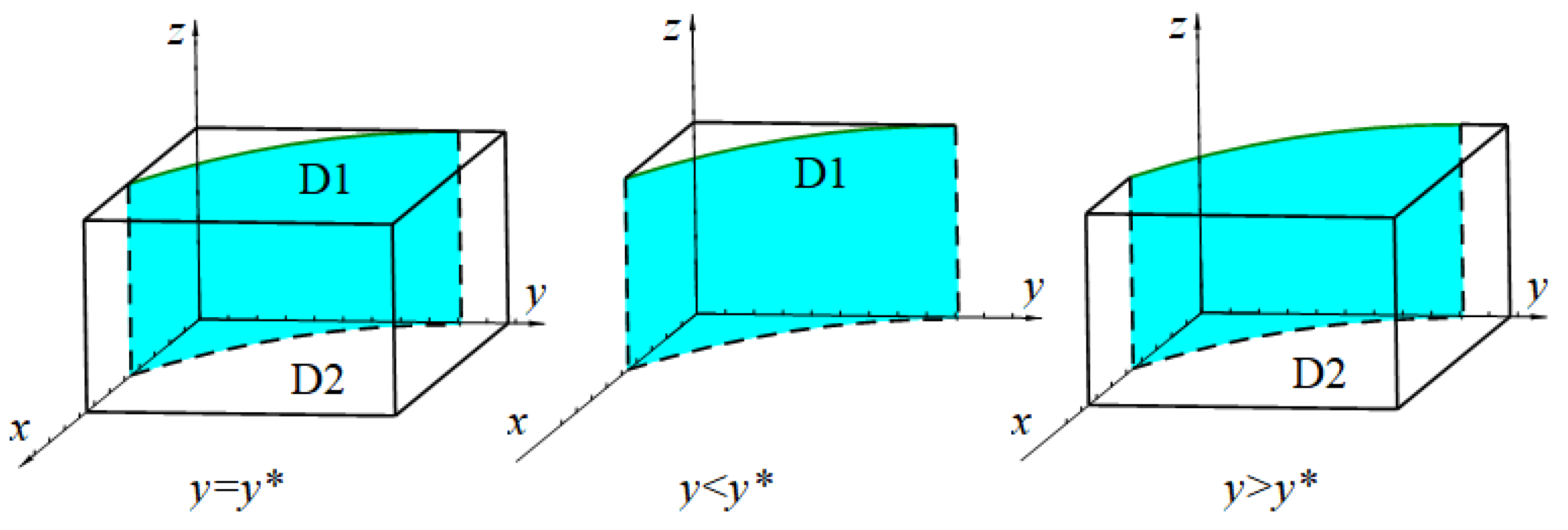 In Figure 4, the volume V D 1 of D 1 is the probability of the farmers’ stable choice of traditional means of production, and the volume V D 2 of D 2 is the probability of stable choice of the new quality means of production. Similarly, applying the same integration methodology, after calculation, we obtain