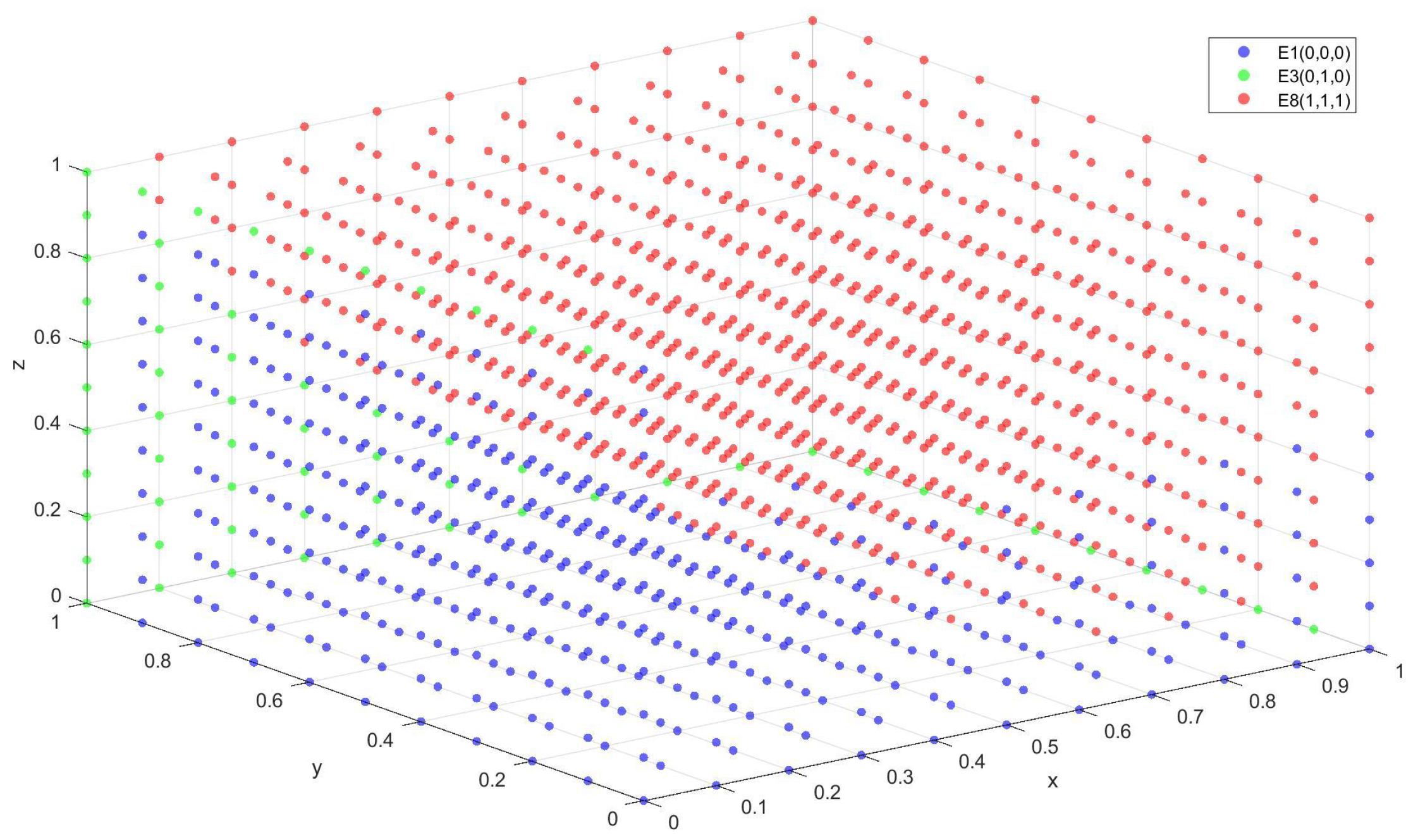 These probability volumes are calculated by integrating over the strategy space. In the unit cube representing all possible initial strategy combinations ( x , y , z ) [ 0 , 1 ] 3 , the stability analysis defines a critical surface that partitions the cube into regions where different strategies prevail. The volume of each region corresponds to the probability of converging to that particular stable strategy.
