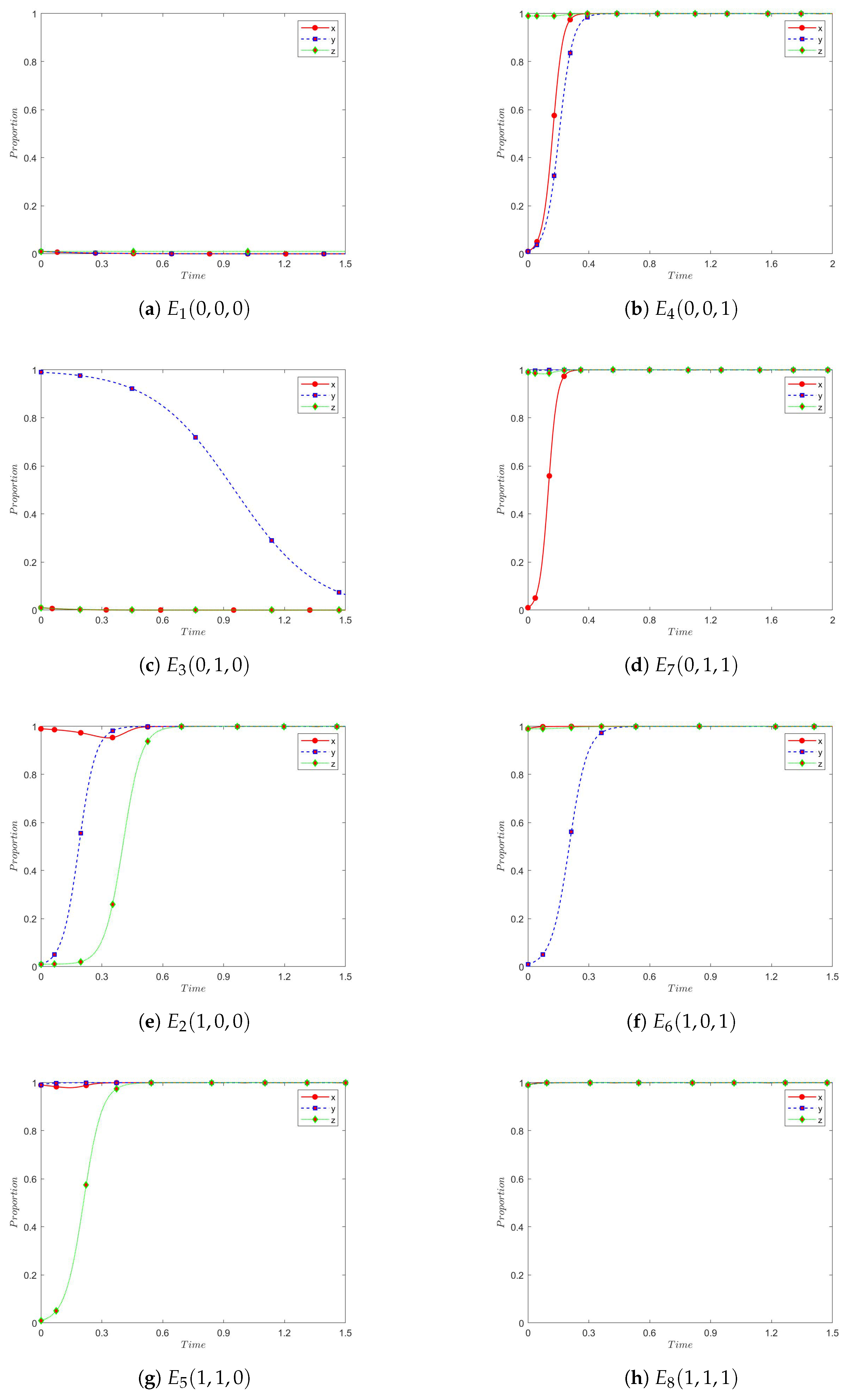 Table 3. The stability analysis of pure strategy equilibrium points.