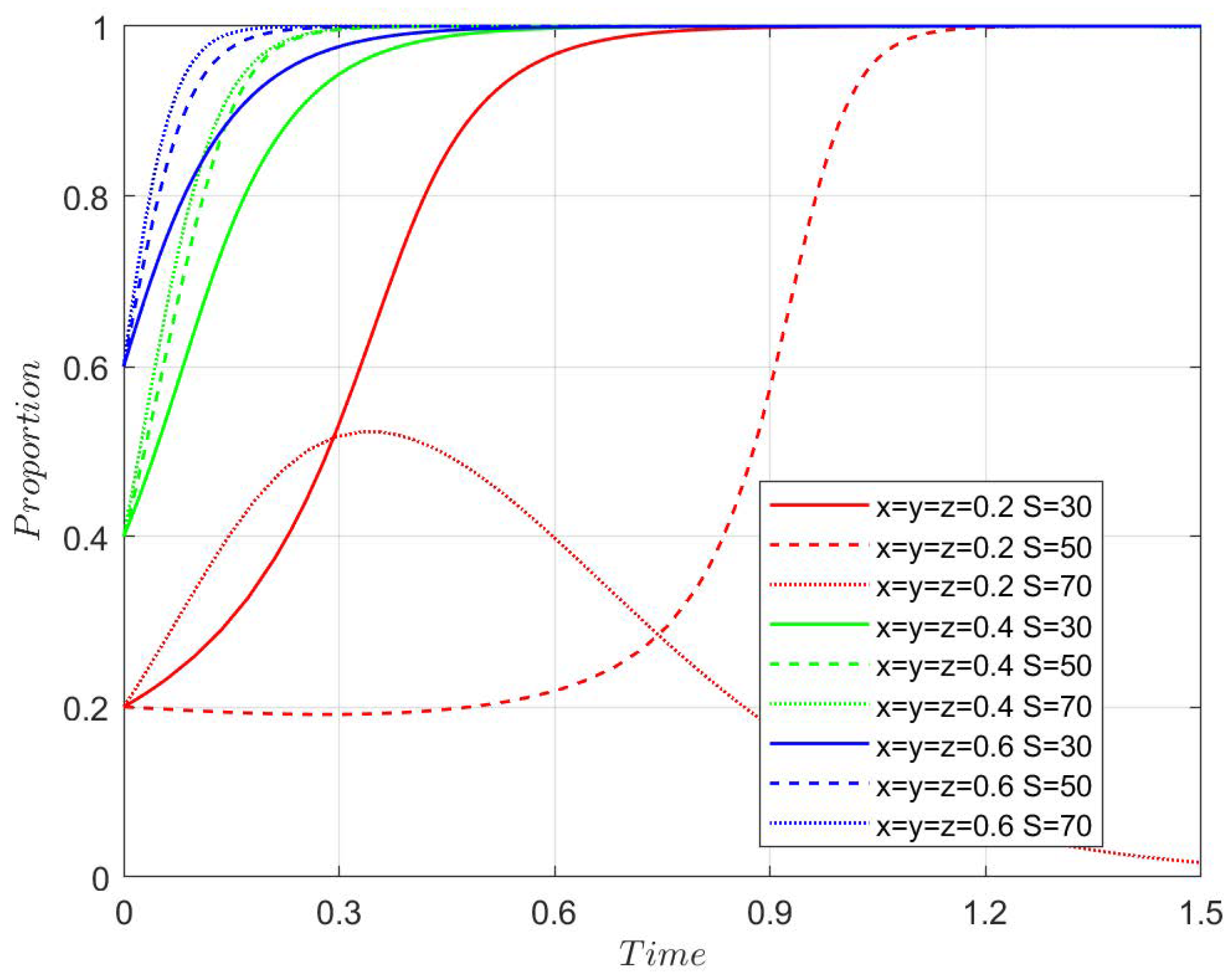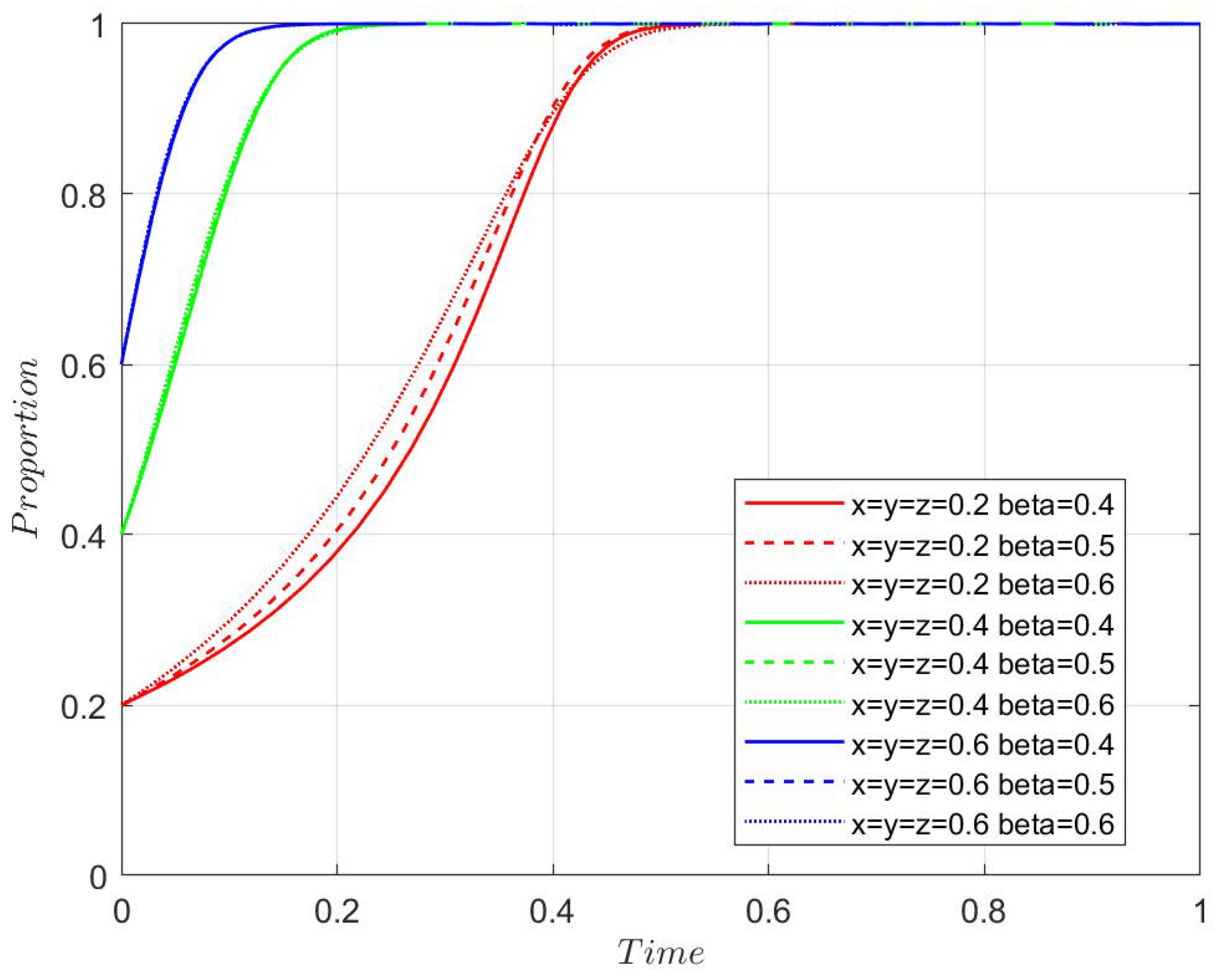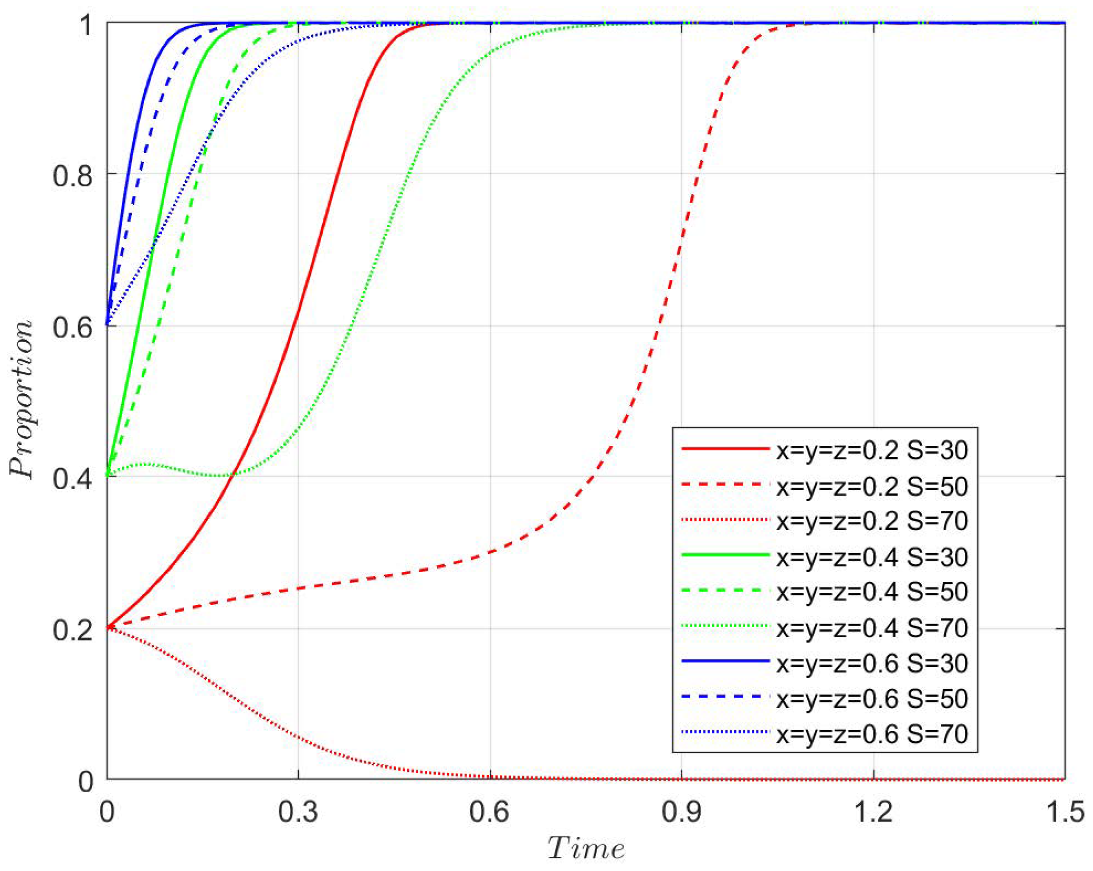 The three parties in the game are government, agricultural enterprises, and farmers, all of which are participants with bounded rationality. At the beginning of the evolution, three parties are in their initial stages. During the process, no other potential influencing factors are considered, and the strategies of the three parties evolve over time and ultimately converge to stable strategies.
