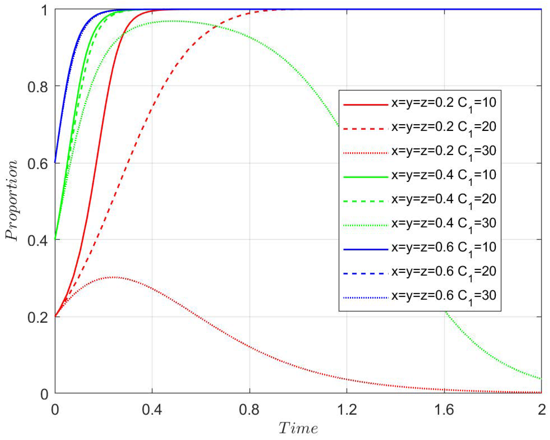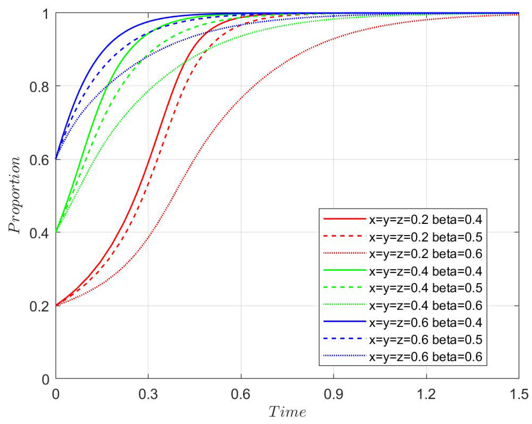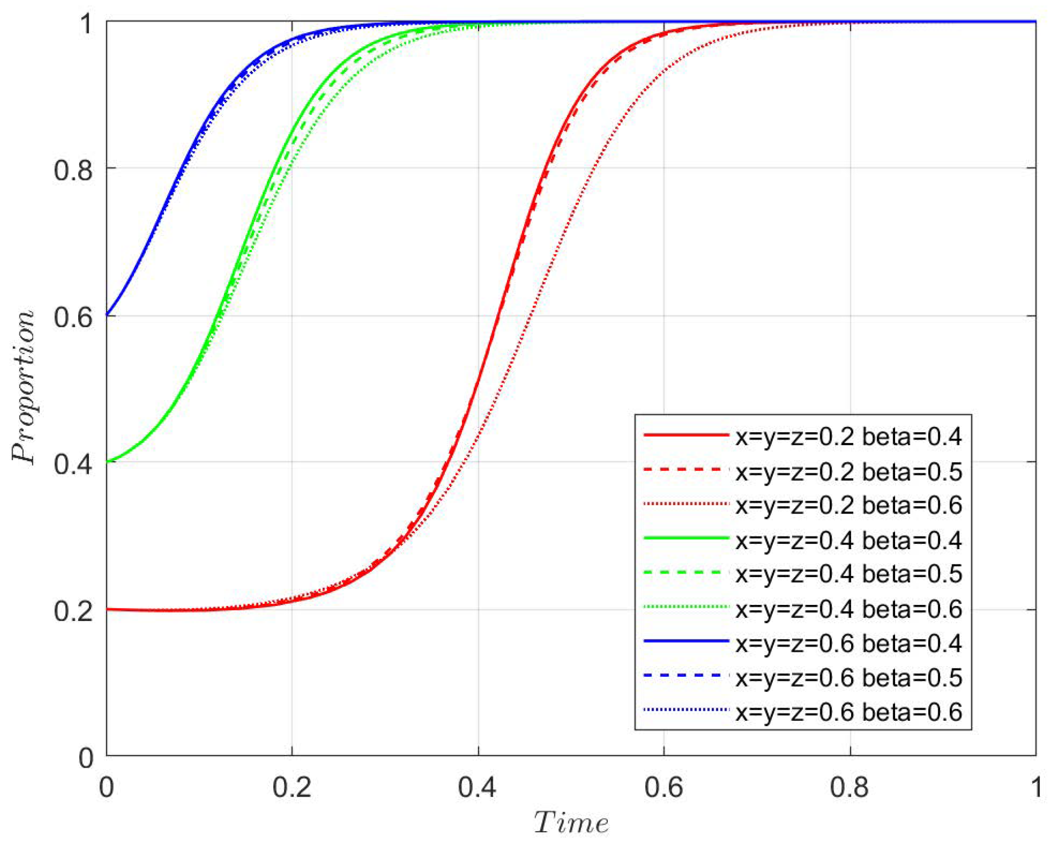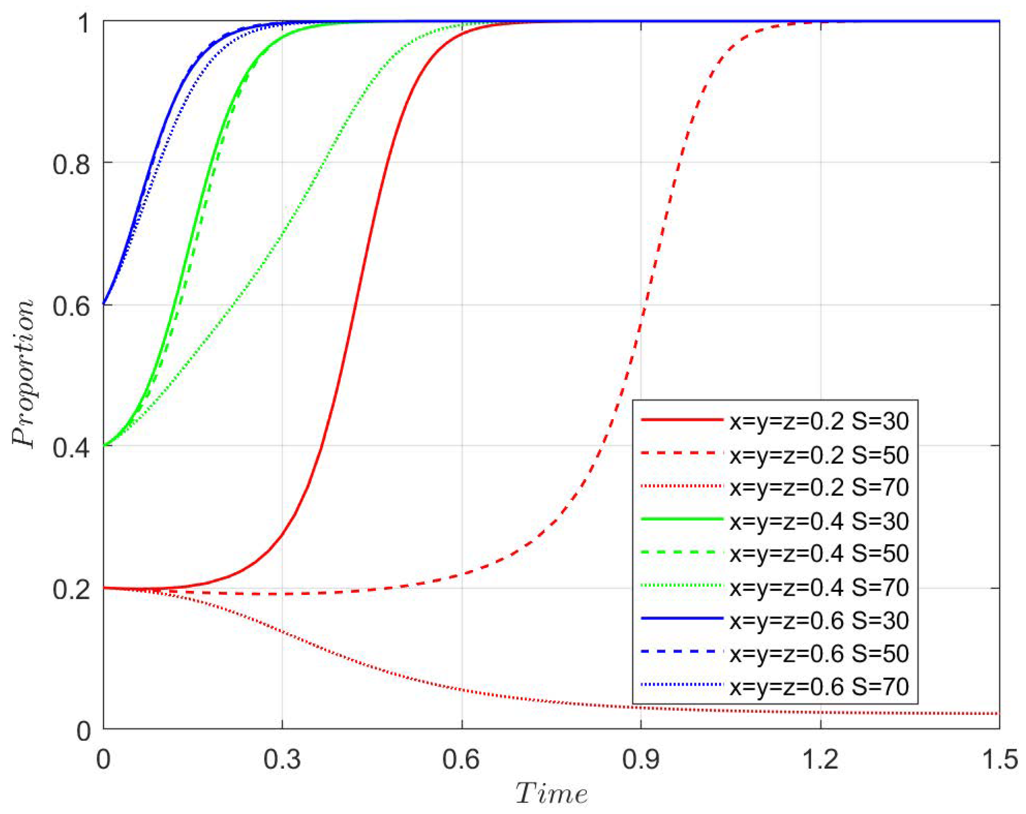 The three parties in the game are government, agricultural enterprises, and farmers, all of which are participants with bounded rationality. At the beginning of the evolution, three parties are in their initial stages. During the process, no other potential influencing factors are considered, and the strategies of the three parties evolve over time and ultimately converge to stable strategies.