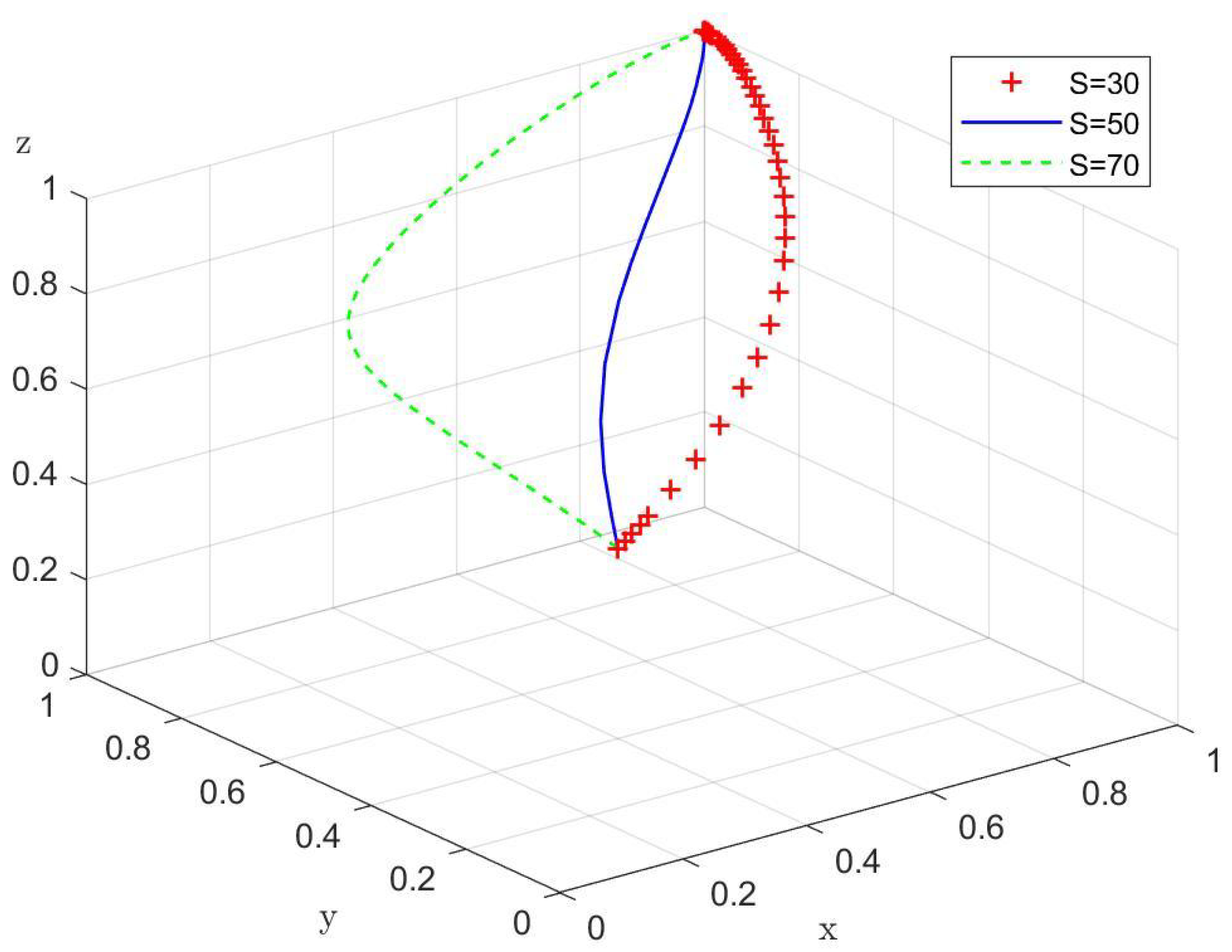 Let G ( z ) = C 1 R x y ( R y λ R y α S ) z ( R z μ R z ) + y z ( β S F ) . According to the stability theorem of differential equations, the government’s strategy of choosing the subsidy will stabilize if F ( x ) = 0 and d F ( x ) d x < 0 . Since G ( z ) z < 0 , G ( z ) is a decreasing function with respect to z.