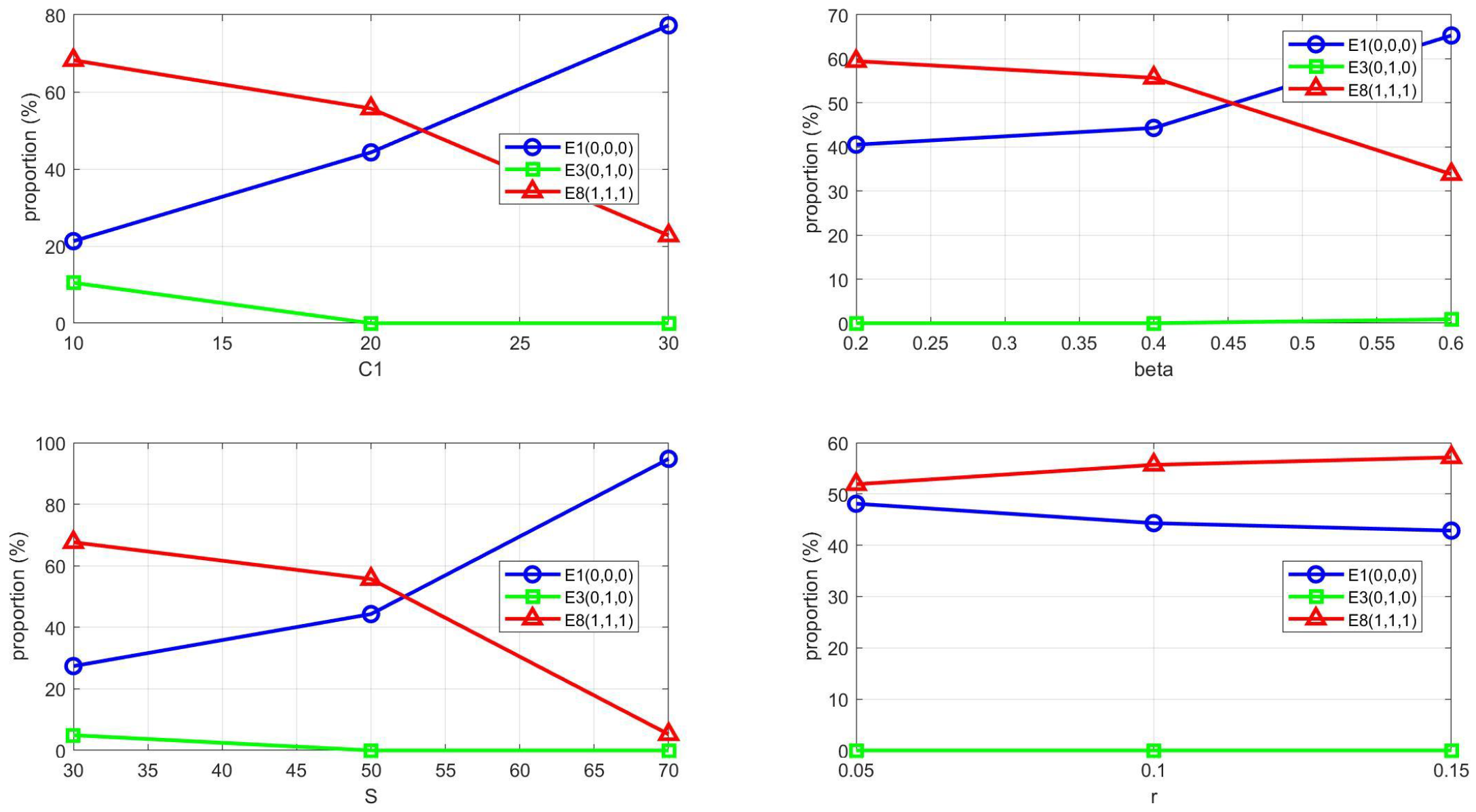 Proposition 1 indicates that higher objective benefits for agricultural enterprises and farmers, as well as greater benefits from construction and transformation, lead to increased enthusiasm among them. Consequently, policy implementation becomes easier, and the government becomes more proactive in selecting subsidies. Conversely, when the cost of infrastructure reconstruction and construction rises, policy implementation becomes more challenging, resulting in the government adopting a more passive stance towards subsidies.