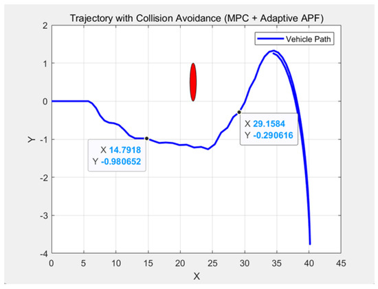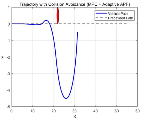 Model Predictive Control (MPC) predicts the vehicle’s motion within a fixed time window, known as the prediction horizon, and calculates potential collision risks with obstacles in advance. It then determines the optimal steering input to guide the vehicle safely around obstacles. For example, when a sudden obstacle appears, sensors detect it, and MPC uses the vehicle’s current speed, position, and heading to predict its driving trajectory over the next few hundred milliseconds to several seconds. If a collision is predicted, MPC computes the optimal steering path among possible avoidance trajectories that are feasible within the vehicle’s dynamics. The vehicle then follows this input to steer away from the obstacle. In the proposed method, MPC is combined with Adaptive Artificial Potential Field (APF). The APF dynamically adjusts the repulsive force based on the distance and relative speed to the obstacle. MPC predicts the optimal driving path and generates control inputs, while the avoidance vector from APF is integrated into MPC’s constraints or cost function. Simulation results demonstrate that the proposed method significantly improves obstacle avoidance response, steering smoothness, and path stability compared to the baseline MPC approach.