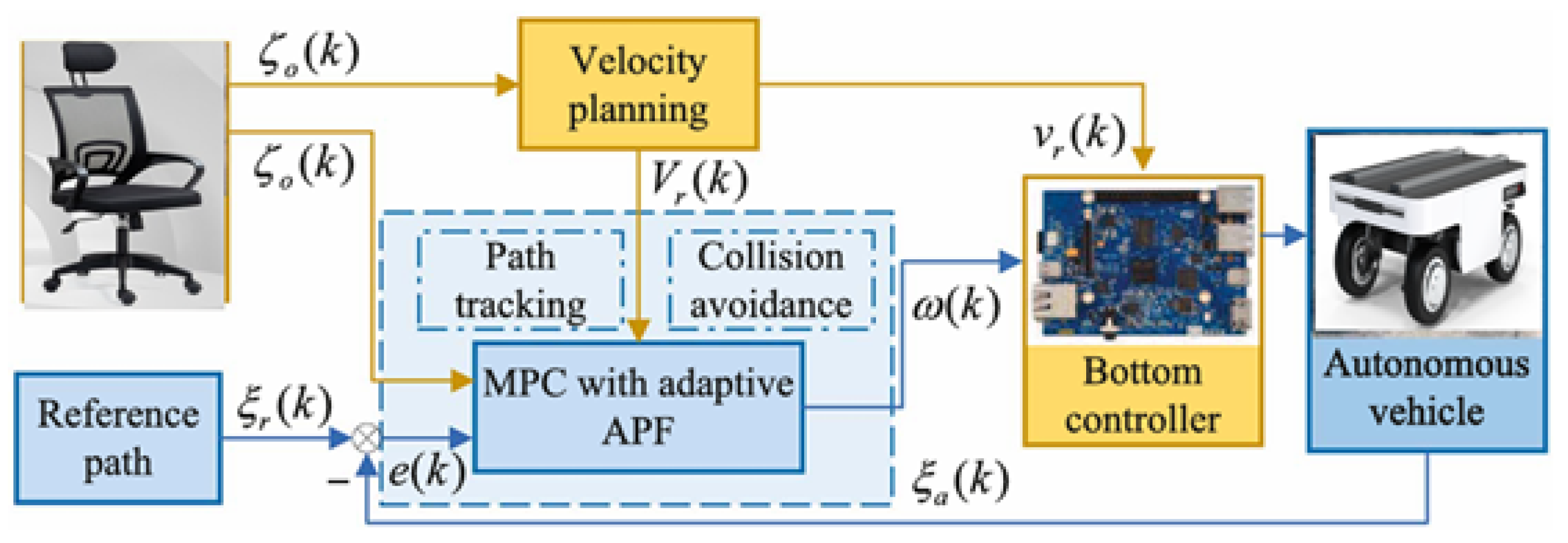 - Yang, H.; Wang, Z.; Xia, Y.; Zuo, Z. EMPC with Adaptive APF for Obstacle Avoidance and Trajectory Tracking. ISA Trans. 2023, 135, 438–448. [Google Scholar] [CrossRef] [PubMed]