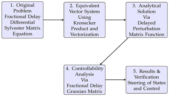 A schematic overview of the proposed methodology for solving and analyzing the controllability of fractional delay differential Sylvester matrix equations.